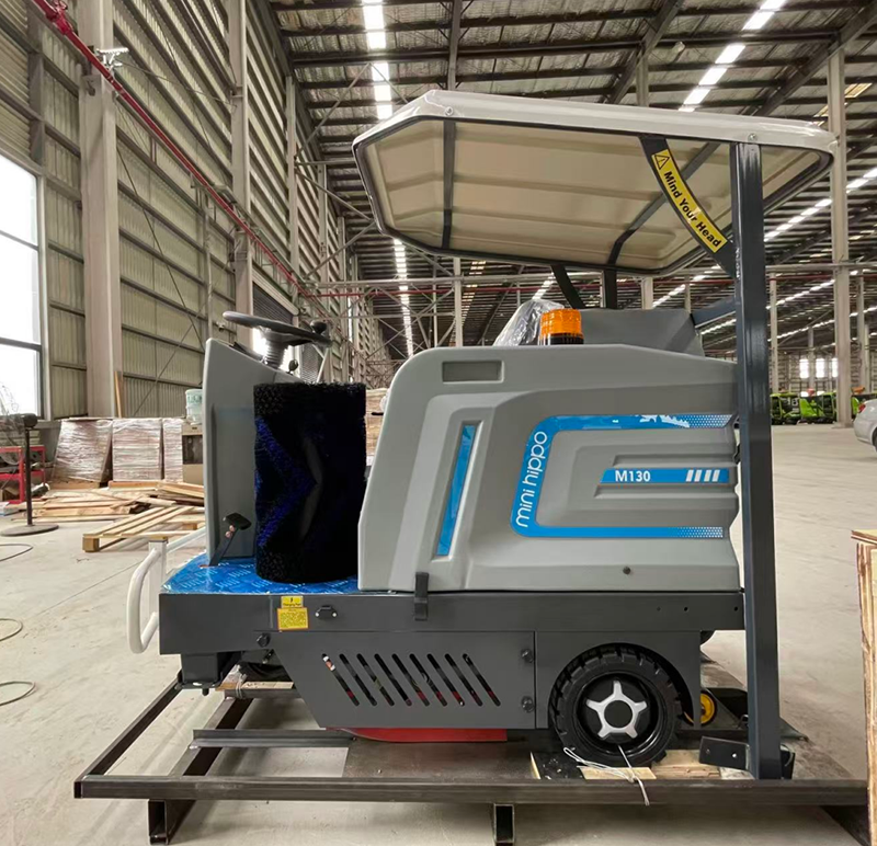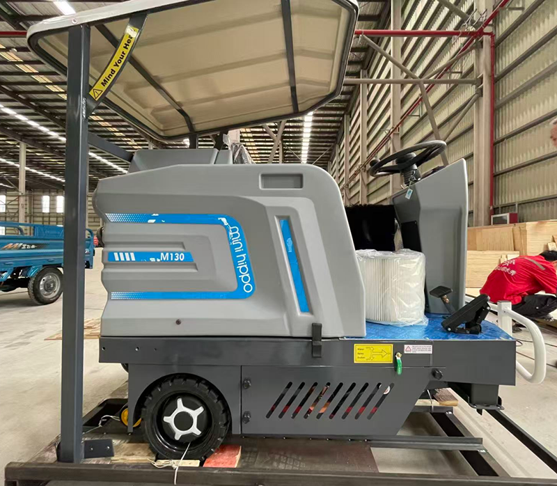 We exported an M130 Ride-On Sweeper to the UK. With a 1.1 m turning radius and 8,000–10,000 ㎡/h efficiency, it’s perfect for narrow streets, and the sunshade plus electric dust removal keep it eco-friendly and practical.