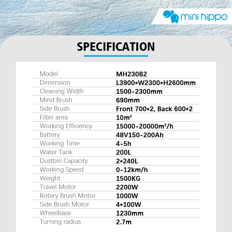 1.清扫宽度为1500-2300mm,每小时可高效清洁15000平方米以上的地面